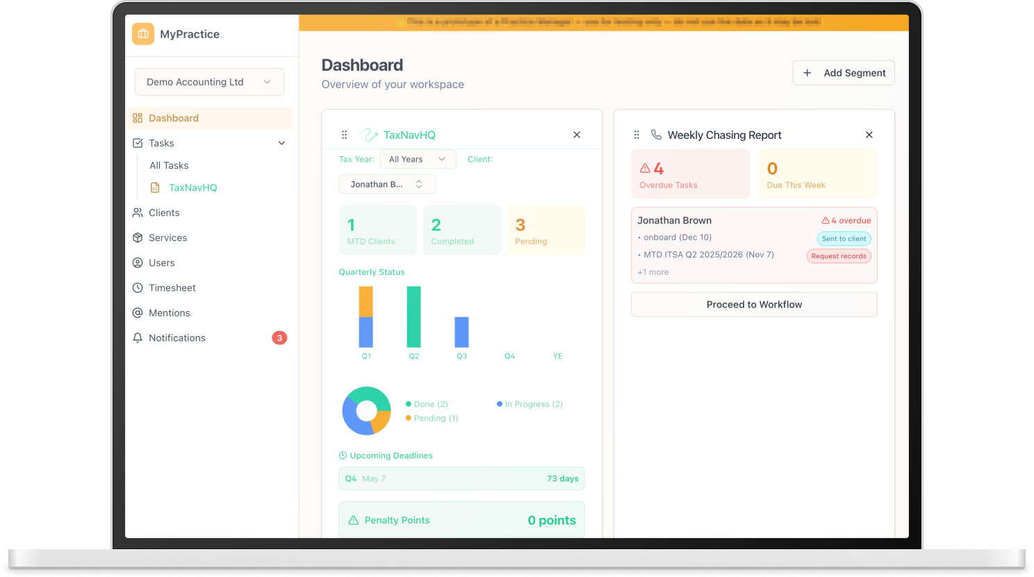 TaxNavHQ provides a complete dashboard view of all your clients using TaxNav to submit their quarterly returns. One screen. Every client. Full visibility.